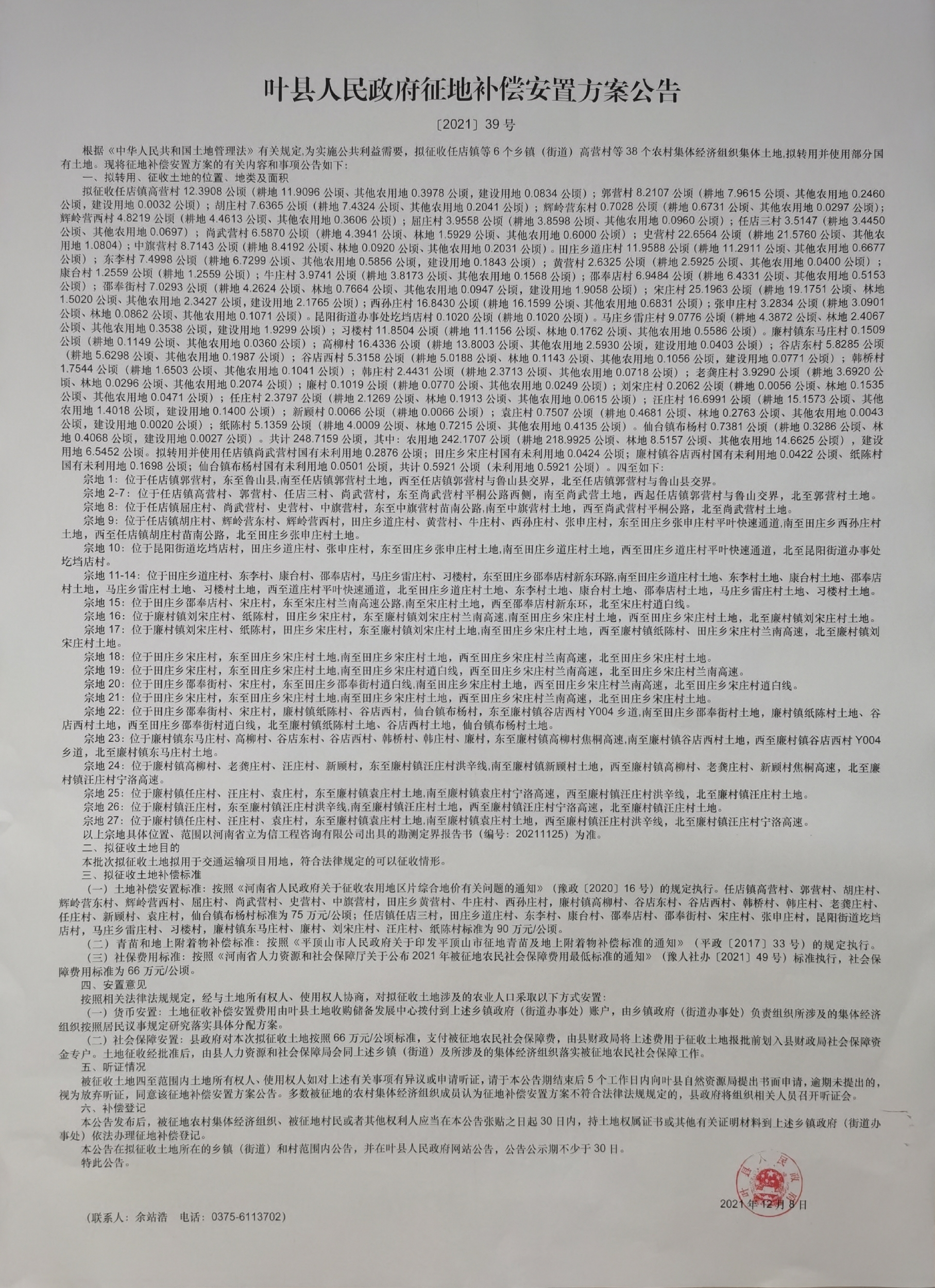 叶县人民政府征地补偿安置方案公告[2021]39号