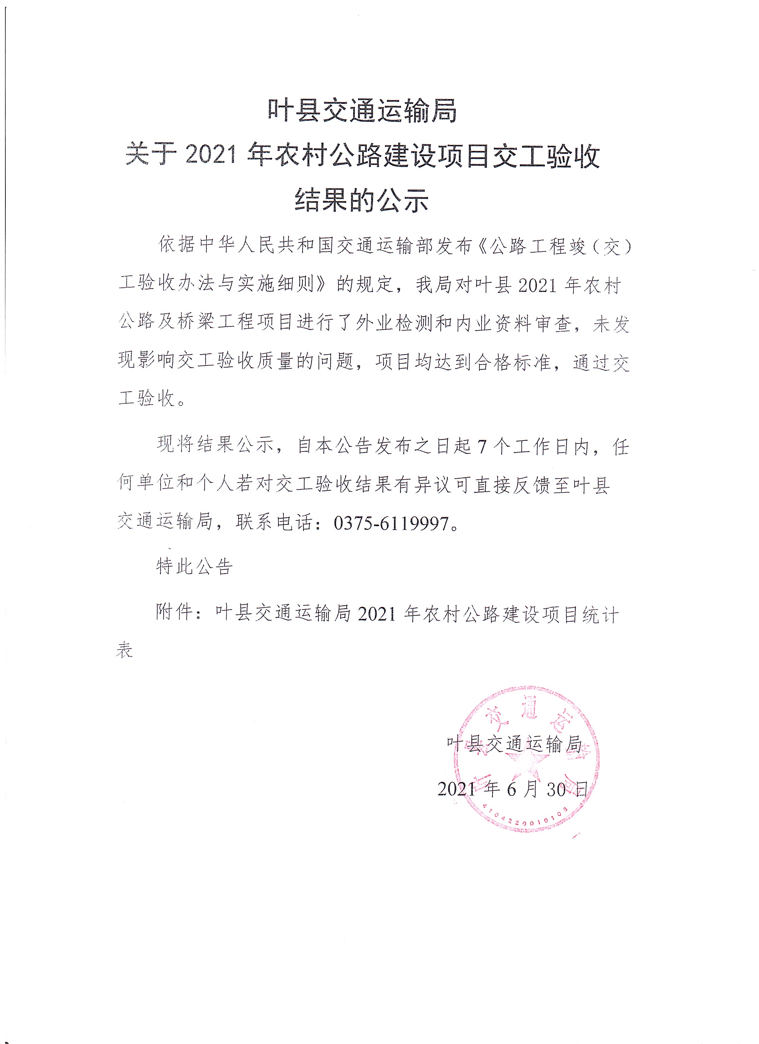 叶县交通运输局关于2021年农村公路建设项目交工验收结果的公示